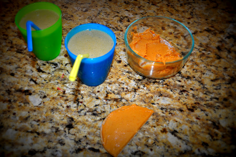 Our daily lunch- Owen is now on the smoothie train. I have to fight them both off to get a sip in before they put down a whole batch on their own- broccoli, kale, coconut milk, mango, banana, yogurt- yummm. And, we also eat what I call "peanut butter dip" on this thin pita-type bread- perfect for toddlers- they should call it toddler bread. The dip is half peanut or almond butter, half plain yogurt and some pureed fruit or applesauce mixed in for a little extra flavor. I have to say, it is quite good- goes down a bit easier than plain peanut butter.